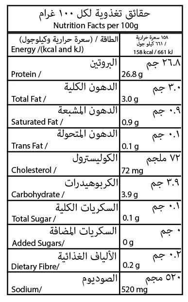 Ingredients: Free-range hormone-free chicken (84%), pasteurised egg white, tapioca flour, hickory smoke, sea salt.